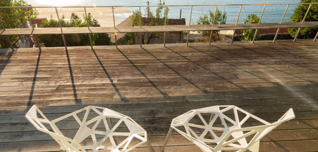 Terraza con tumbona y sillas
